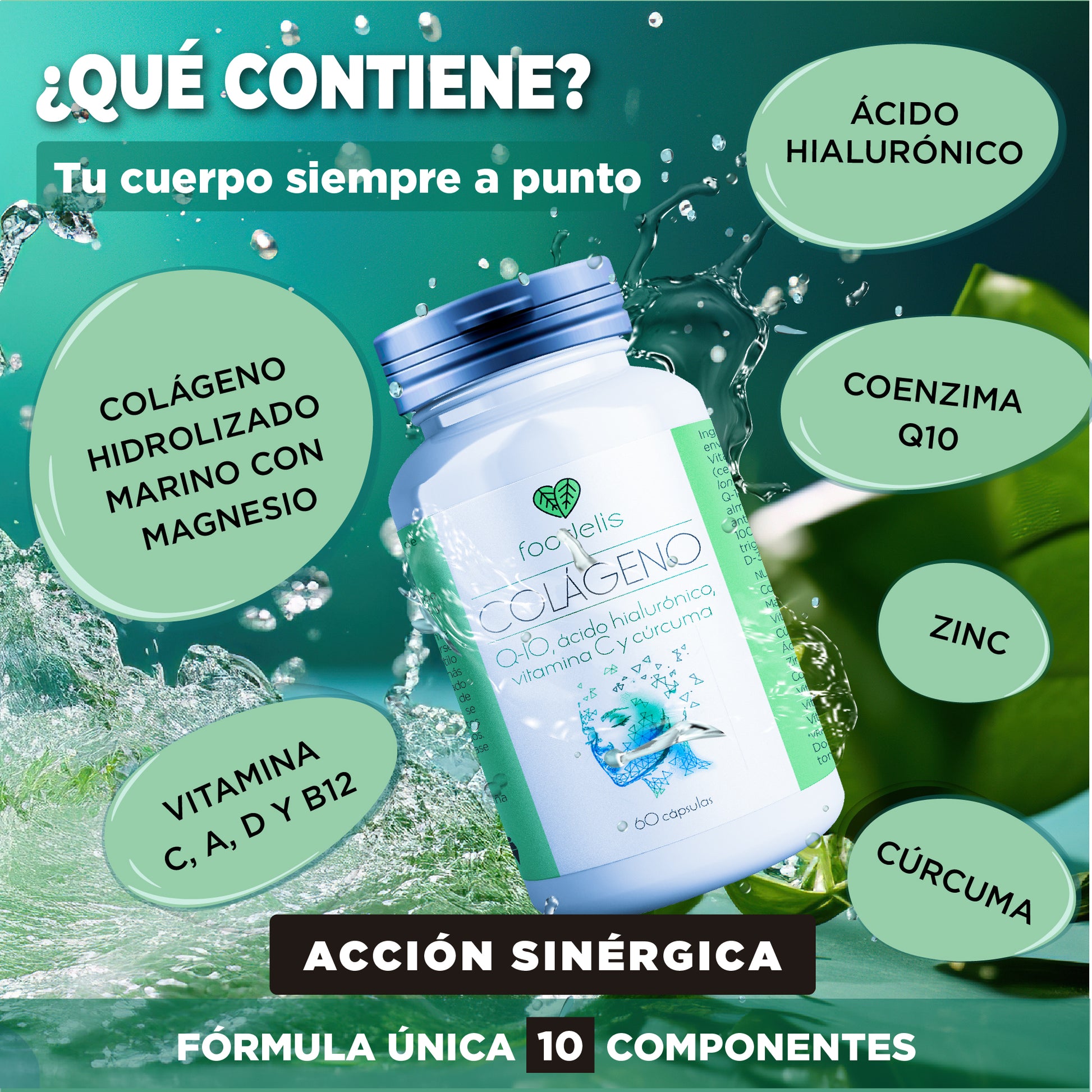 - Colágeno hidrolizado marino (pescado), envoltura (gelatina bovina), Óxido de Magnesio, Vitamina C (Ácido L-Ascórbico), agente de carga (celulosa), Cúrcuma extracto seco de rizoma (Curcuma longa), Citrato de Zinc, Ácido Hialurónico, Co-enzima Q-10, Vitamina A [gelatina porcina, azúcar, almidón de maíz, Vitamina A (acetato de retinilo) y antioxidante (E321)], Vitamina D-3