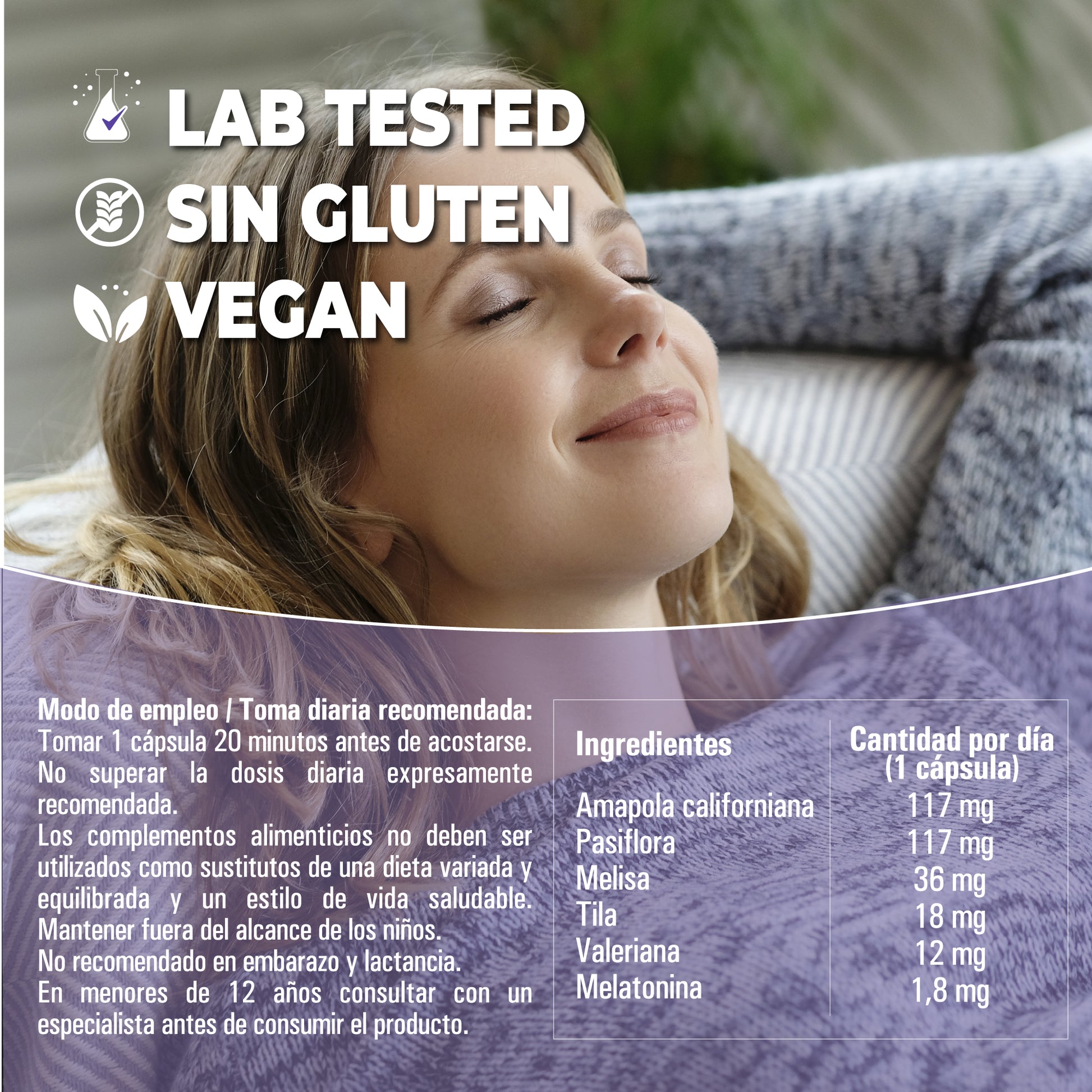 ¿Qué puedes esperar?Este suplemento cuenta con 1'8 mg de melatonina pura por dosis, complementados por la poderosa acción de 5 extractos naturales de plantas con reconocidos efectos sedantes y relajantes.